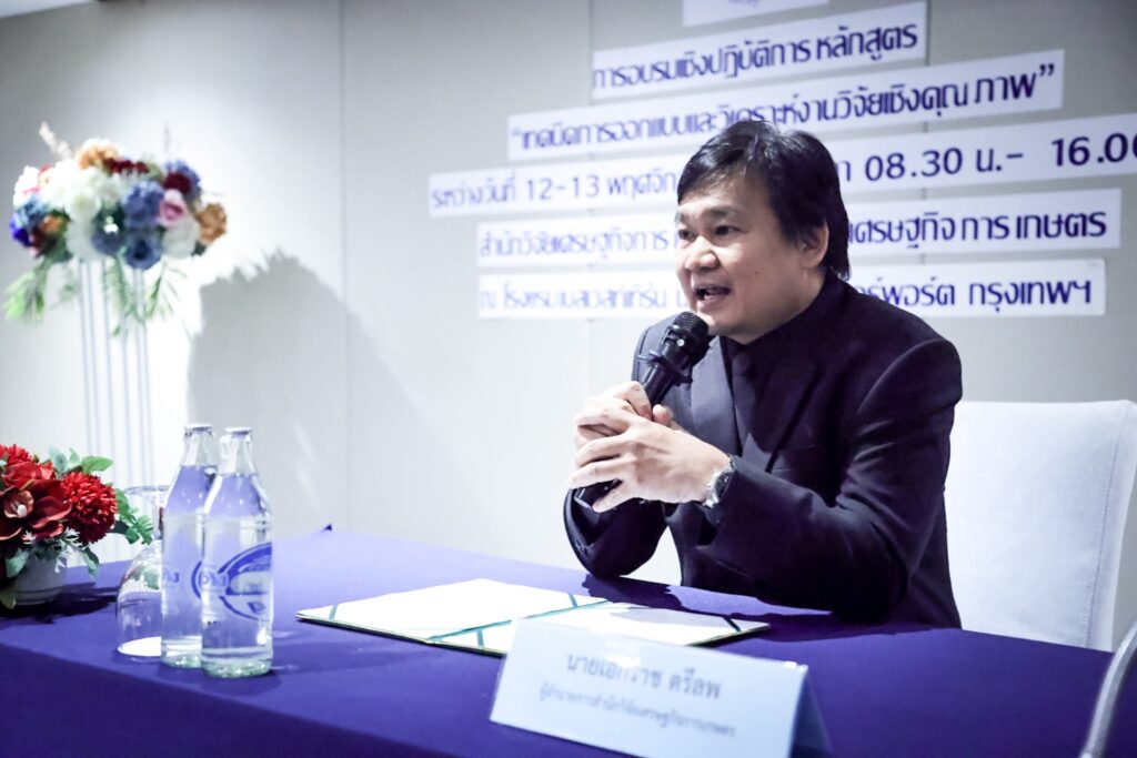 วันที่ 12 พฤศจิกายน 2568 นายเอกราช ตรีลพ ผู้อำนวยการสำนักวิจัยเศรษฐกิจการเกษตร เป็นประธานการอบรมเชิงปฏิบัติการหลักสูตร “เทคนิคการออกแบบและวิเคราะห์งานวิจัยเชิงคุณภาพ” ณ โรงแรมเบสท์เวสเทิร์น นาดา ดอนเมืองแอร์พอร์ต โดยมีนางสาวสุกัลยา กาเซ็ม ผู้เชี่ยวชาญด้านเศรษฐกิจทรัพยากรธรรมชาติทางการเกษตร กล่าวรายงาน ซึ่งมีวัตถุประสงค์เพื่อส่งเสริมให้นักวิจัยและบุคลากรของสำนักงานเศรษฐกิจการเกษตรมีความรู้เกี่ยวกับการออกแบบและวิเคราะห์งานวิจัยเชิงคุณภาพในการวิเคราะห์ข้อมูลและทำวิจัยทางการเกษตรได้อย่างมีประสิทธิภาพ